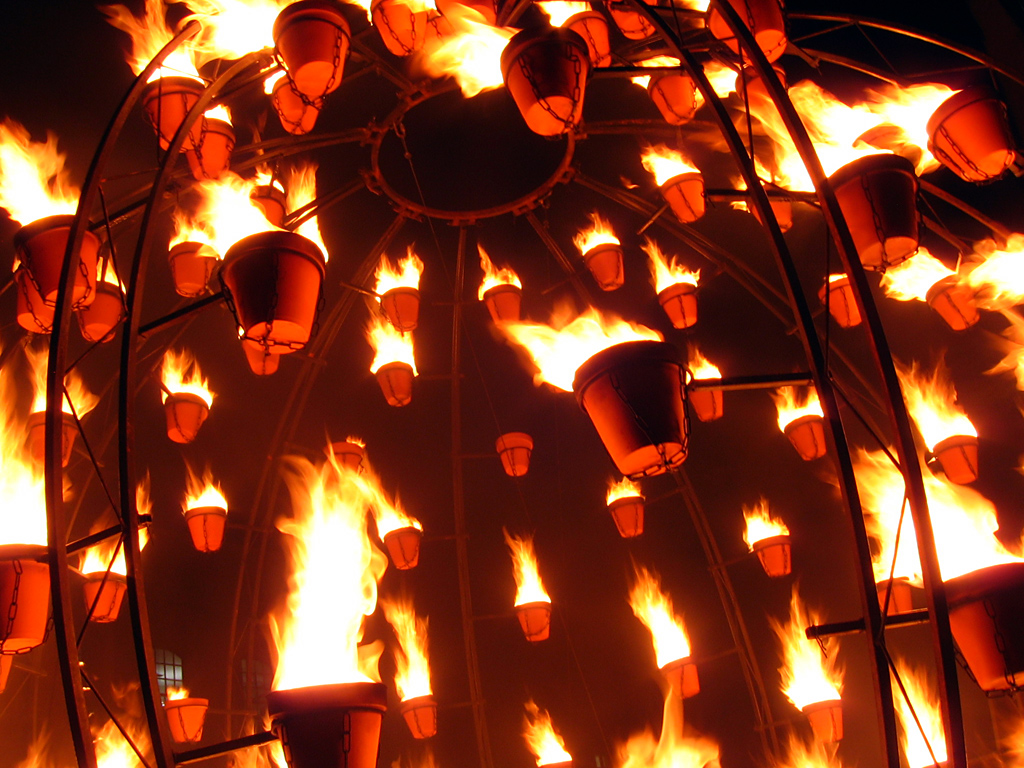The Luminox festival is really quite something. Essentially a celebration of combustion, it runs all along Broad Street from 7:00pm to 10:00pm for the next two days. The event involves a combination of fire-based artistic displays and live music. The whole thing seems to be paraffin powered, and it includes both static displays and manned installations that are made to flare up with the removal of chokes. Spaced along the road are braziers of coal and wax-burning metal chimneys that glow orange hot. Hanging from a crane beside Balliol College is a massive chandelier of flame.
