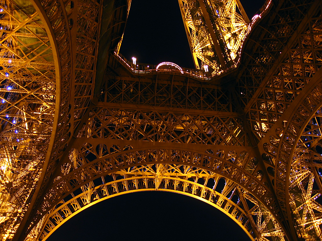 That arrangement became entirely evident one Metro ride later, when we found ourselves at the base of that elegant structure. As well as being lit by large numbers of tungsten lights – giving the structure an orange glow and nicely illuminating how the girders connect – the tower has been covered with thousands of flash bulbs that sometimes begin firing, seemingly at random. This creates the same kind of effect you see in movie portrayals of stadiums: where thousands of fans all firing flashes create a sparkling effect in the stands. Walking away from the tower, towards the former military academy, one follows a long lawn covered by young people arranged similarly to those on the bridge.