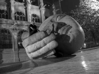 The plaza containing the head. I almost broke my leg taking this photo, as I had to do it standing inside a fountain. The metal grates at the bottom that seemed firmly fixed actually shifted aside quite easily, plunging you into the shaft under them.