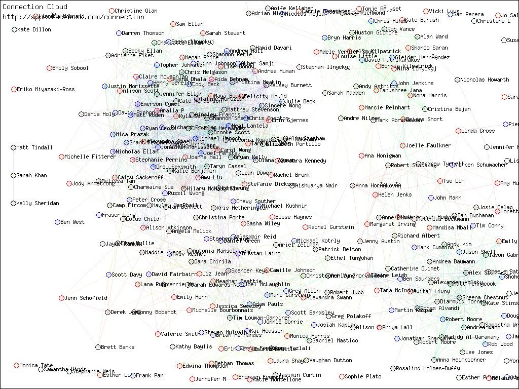 The dense cluster on the left is a tangle of high school and undergrad. The much smaller grouping on the right is Wadham College, Oxford. All around the edges and bottom are relatively or entirely isolated people – evidence of how many people I meet and random and at a sufficient level to warrant a Facebook linkage.