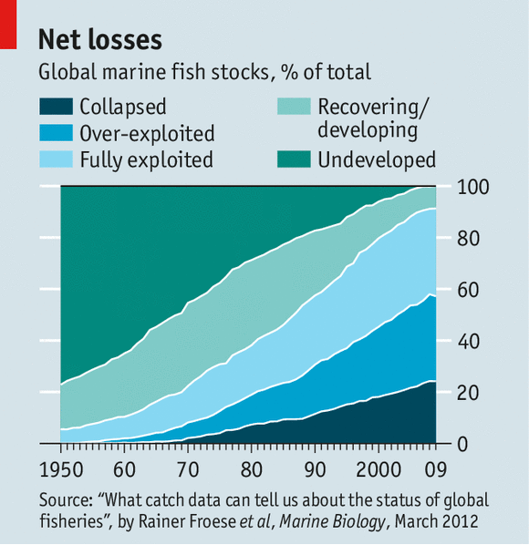 25. Though the fuel needed to get to the high seas is pricey, taxpayers often pick up part of the tab in the form of government subsidies. Such subsidies, combined with overexploitation of fisheries closer to land, have made the high seas attractive to fishermen. The consequence, according to the UN’s Food and Agriculture Organisation, is that they, too, are being pillaged. Already, two-thirds of their stocks are being fished beyond sustainable limits and, as they once provided a haven for fish everywhere, yields in EEZs are suffering, too.