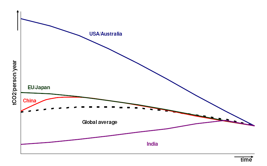 The interim version of the Garnaut Review (mentioned earlier) includes a numberless graph illustrating what the principle of contraction and convergence in per capita greenhouse gas emissions would resemble: