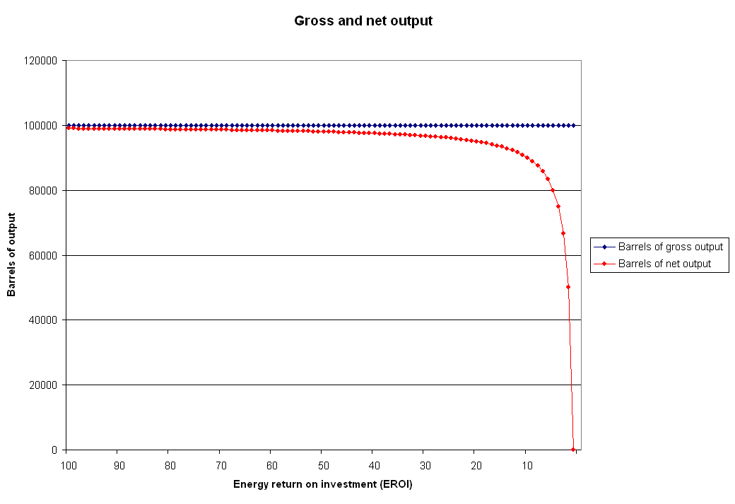 This chart demonstrates one characteristic of a changing energy return on investment (EROI). This is the ratio between how much energy is takes you to produce or acquire an energy source (such as oil, natural gas, biofuel, or hydrogen) and the amount of energy contained within it. This graph relates to a hypothetical oil field that is consistently able to produce 100,000 barrels per day of oil. On the left hand side, the EROI is 100:1. This means that you get 100 units of usable energy for every 1 unit you invest in extraction. This ratio is comparable to some of the best oilfields in Kuwait, where you just need to drill a hole and oil will gush out. On the right, the EROI falls towards 1:1. More and more of the barrels of output (or an equivalent energy source) must be used to extract the oil. By the end, there is no net energy production.