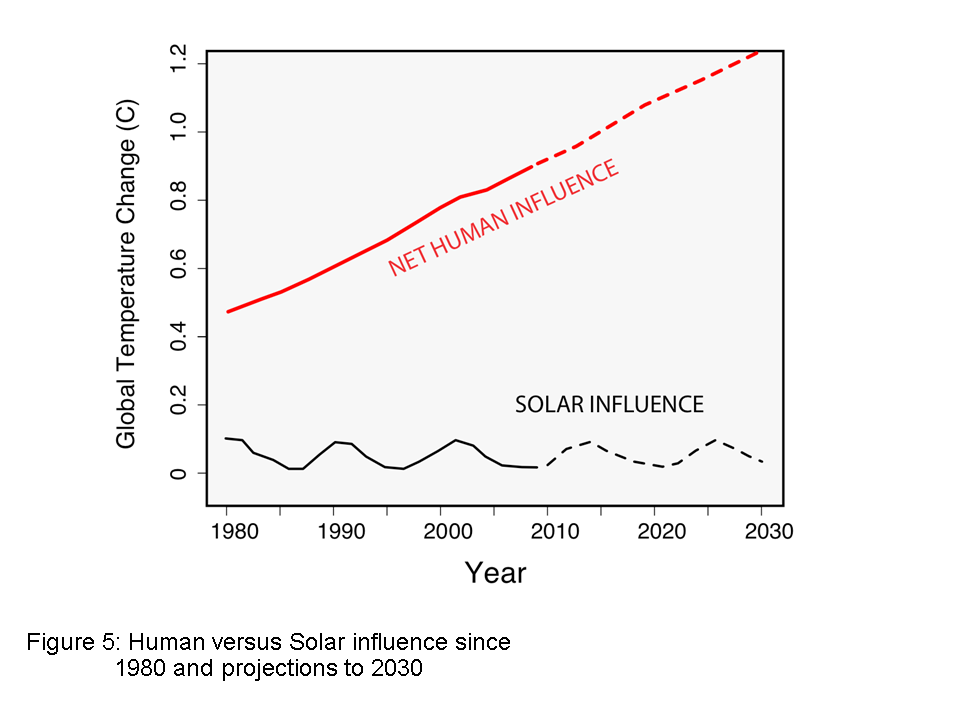 Figure 5. (below) Time-series of solar irradiance alongside the net effect of greenhouse gas emissions (the latter relative to the year 1880; using Meehl et al. 2004) calculated in terms of total estimated impact on global air temperatures; observed from 1970-2008; and projected from 2009-2030 (adapted from Lean and Rind 2009).