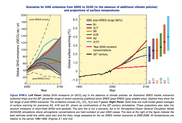Since we don’t know how emissions will change between now and 2100, there is a fair bit of variability in the amount of warming projected. Note that this is precisely because greenhouse gasses are the major driver of climate change.