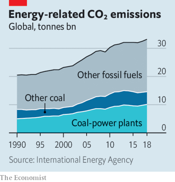 Global energy-related carbon-dioxide emissions grew by 1.4% last year, according to the International Energy Agency, to a record 32.5 gigatonnes. Some big economies, such as America and Japan, saw their emissions decrease; Britain’s fell by 3.8%. Asian countries accounted for two-thirds of the global increase. Despite the growth in renewables, the share of fossil fuels in the world’s energy mix remains at 81%, the same level it has been for three decades.