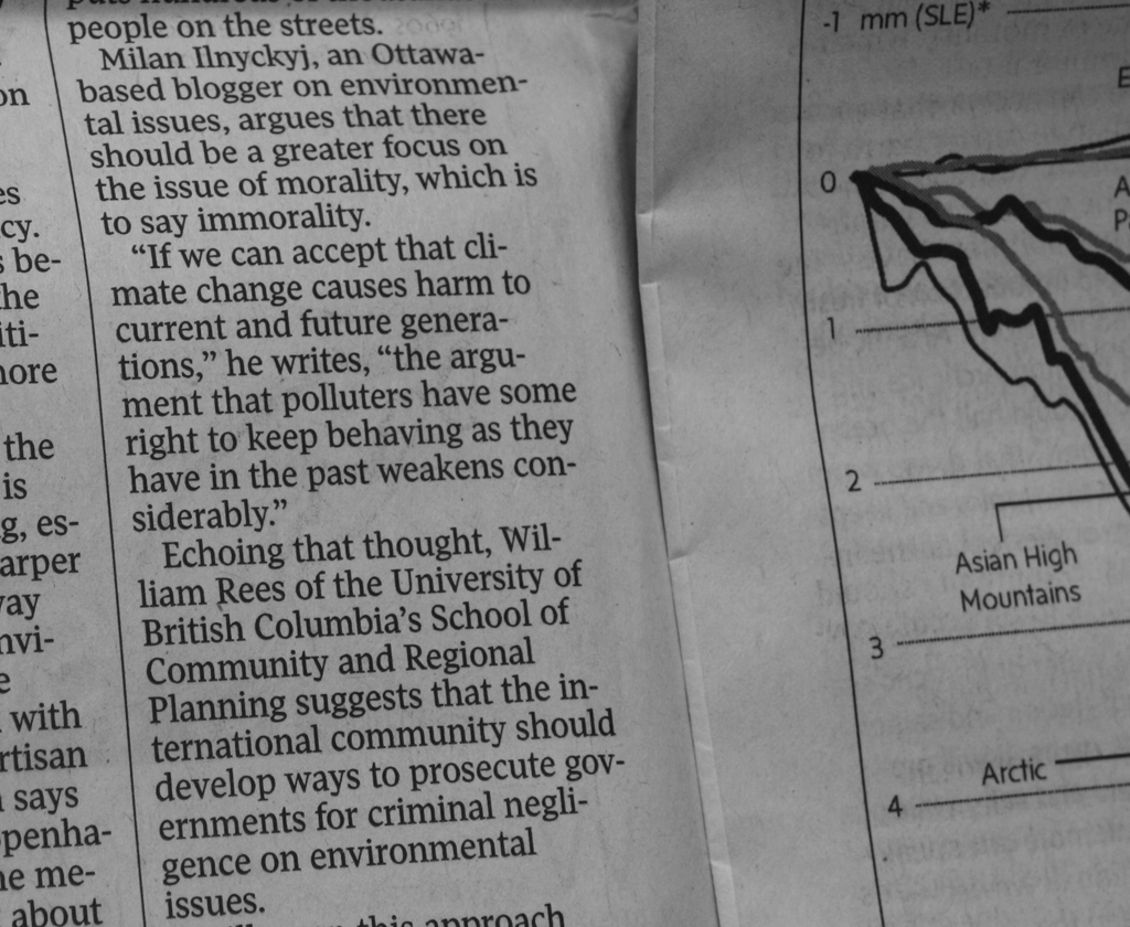 I am mentioned and briefly quoted in a Globe and Mail article about climate change messaging, and the building of political will: Lowering the doom. Also quoted are James Hoggan, David Suzuki, William Rees, and others.