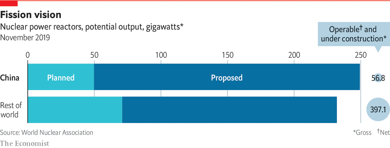 Being a one-party state does not blind China to public concerns about safety. When 40 people died in a high-speed-train collision near the city of Wenzhou in 2011, the public was outraged. Passenger numbers fell; work on new lines was paused; safety procedures were scrutinised. There has not been a similar accident since. After the Fukushima nuclear meltdown in Japan that same year, the Chinese government’s position on new plants went from “active” to “conservative”, says Mr Zou of dfhm, and deployment slowed down. That means China will miss the target of 58gw of nuclear-generation capacity it set itself for 2020. But if, as Mr Zou expects, China continues to build up to eight reactors a year, it should meet the lower end of its target of 120gw by 2030.