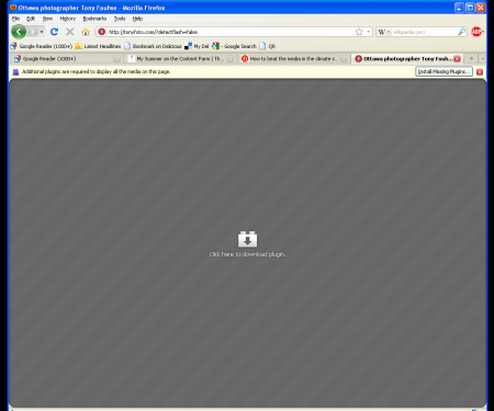 Tony Fouhse is an Ottawa photographer doing great work in a range of fields, from commercial advertising to artistic portraits of Ottawa crack cocaine addicts. He has a Flash-based website (sorry, owners of iPads and new MacBook Airs) and a weekly blog.