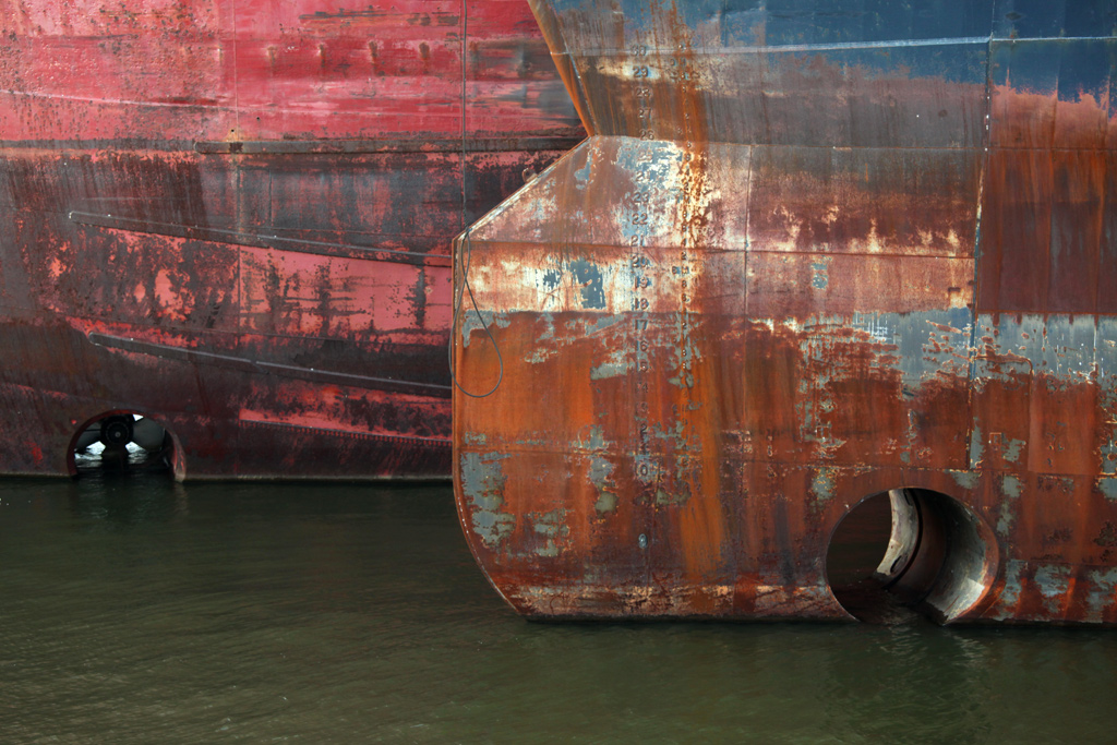 Between two of the moorings for large passenger vessels, a pair of old steamships are currently tied. Quite possibly, they are destined to be sent off for scrap.