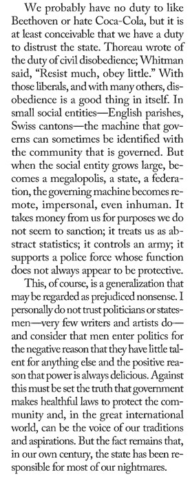 When people are fearful of non-governmental forces, they can easily err and make the government overly mighty. People also need to maintain in their minds the corresponding fear of abuse by government itself. The government is so powerful that it can do considerable harm by accident, and its control over information is such that we may never really know what accidents or abuse have taken place.