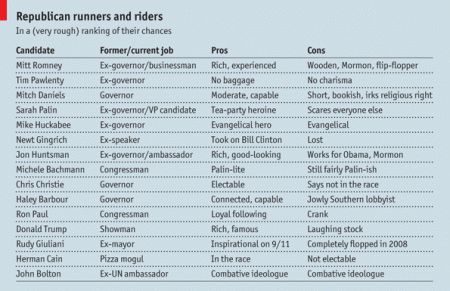 CAN Barack Obama be beaten in next year’s presidential election? That is the question that a squadron of nervous Republicans are asking themselves as they weigh up whether or not to jump into the fray, an undertaking that will cost them hundreds of millions of dollars and prove intrusive, exhausting and quite possibly humiliating. So far only two obscurities have declared themselves, a pizza mogul and a gay-rights activist. But the field is about to start filling out (see article).