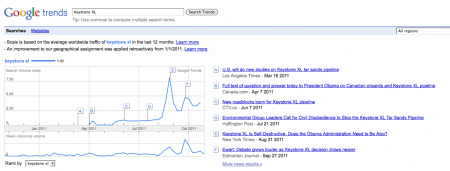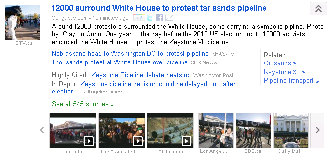 I noticed today in my (unmodified) Google news feed, the very first article in the business section was a Wall Street Journal article about Keystone, with 764 other sources reporting the story. The article mentions the protests and environmental opposition.