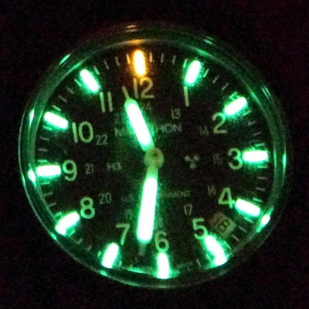 The major distinguishing characteristic of the watch is the way in which it uses tritium-filled tubes for illumination. At each hour marker, as well as on the hour and minute hand, there are tiny tubes of phosphor-coated borosilicate glass containing a minute volume of radioactive tritium. This allows it to be easily read in conditions of total darkness. The tritium atoms are constantly undergoing beta decay and turning into helium-3. This process produces an electron with about 5.7 keV of energy and an electron anti-neutrino. The electrons hit the phosphors, causing the glow. The watch glows with radioactive fire, using the transmutation of hydrogen into helium for energy. It also produces antimatter that zips easily through the planet.