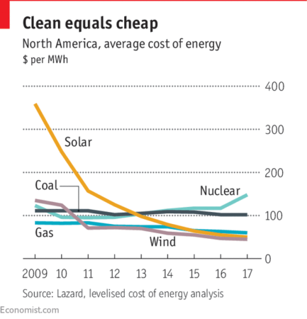 Most important, the economics of power is being turned on its head by the falling costs of renewables. The “levelised” cost of electricity—which includes capital and operating spending to generate it over a plant’s lifetime—is now lower for wind or solar power than it is for coal. Coal’s share of power generation has sunk from about half in 2005 to 27% in 2018. It will fall further, despite President Donald Trump’s plan, announced in June, to loosen regulation of coal plants.