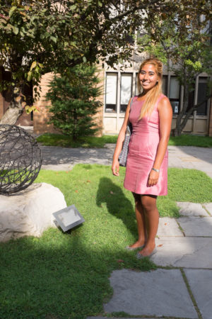 Junior Fellow and expert singer Victoria Fard beside the Sanctuary sculpture in the quad at Massey College