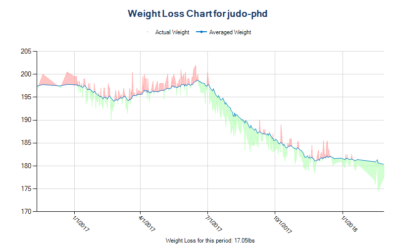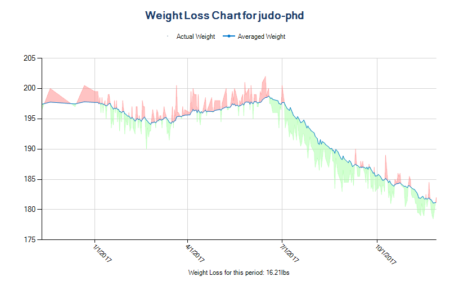 Over the course of the term since September, I have noticed myself progressively gaining weight and am now at the point that I am the heaviest I can recall being at around 200 lbs. This was happening at the same time as I was doing Judo twice a week, but I suspect only a fairly small fraction of the weight gain is from muscle. In fact, I suspect excess weight may be contributing to my apparent tendency to get injured infrequently often during class.