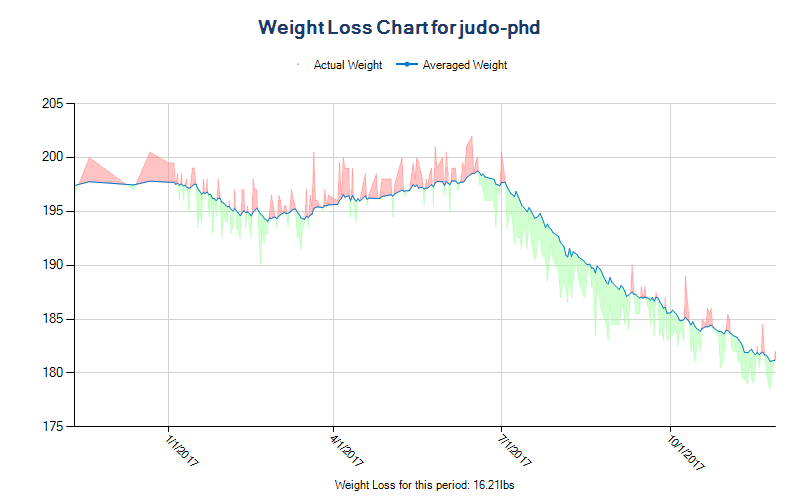 I have generally found 185 lbs to be a manageable, though not ideal, weight. I am going to try to trend back toward that level despite continuing with Judo in January, and will hopefully stop popping buttons off my MEC cargo trousers.