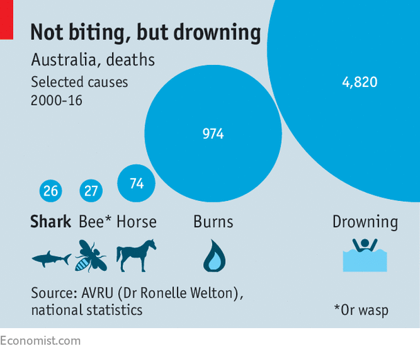 In fact, the risk is infinitesimal. The same number of people died in attacks last year as in 1950, when the population was a third of its current size. Better emergency services mean that the vast majority of today’s victims survive. Sharks may cause politicians to thrash about, but Australians run about the same risk of being killed by a bee or wasp.