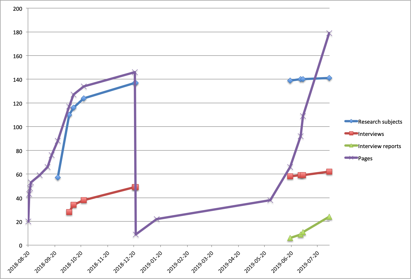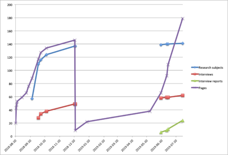 Number of pages in Word manuscript by date, along with number of desirable research subjects identified, interviews conducted, and interview reports completed: