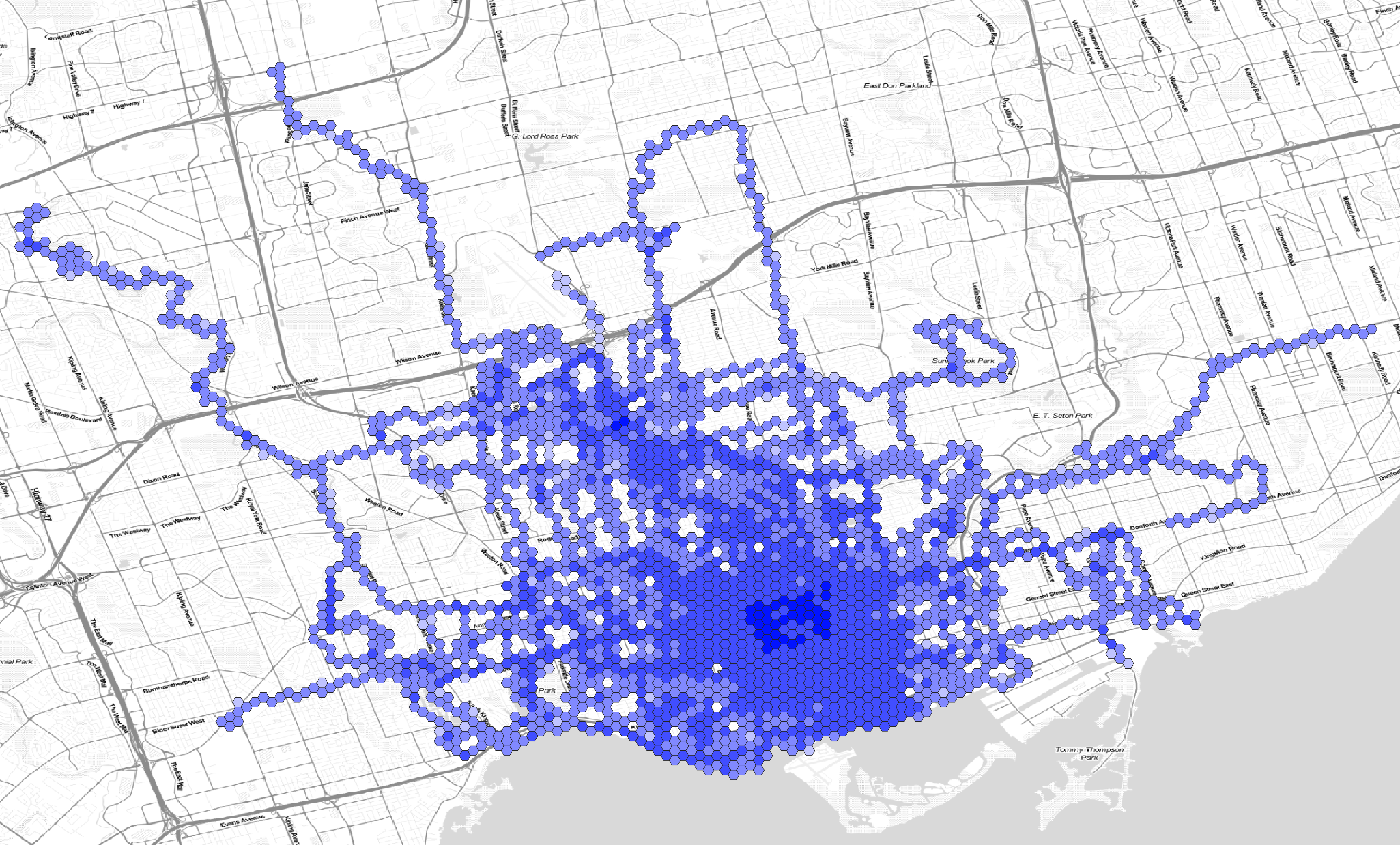 Here are the hexagons semi-transparent and rendered on a faux watercolour of the Toronto area: