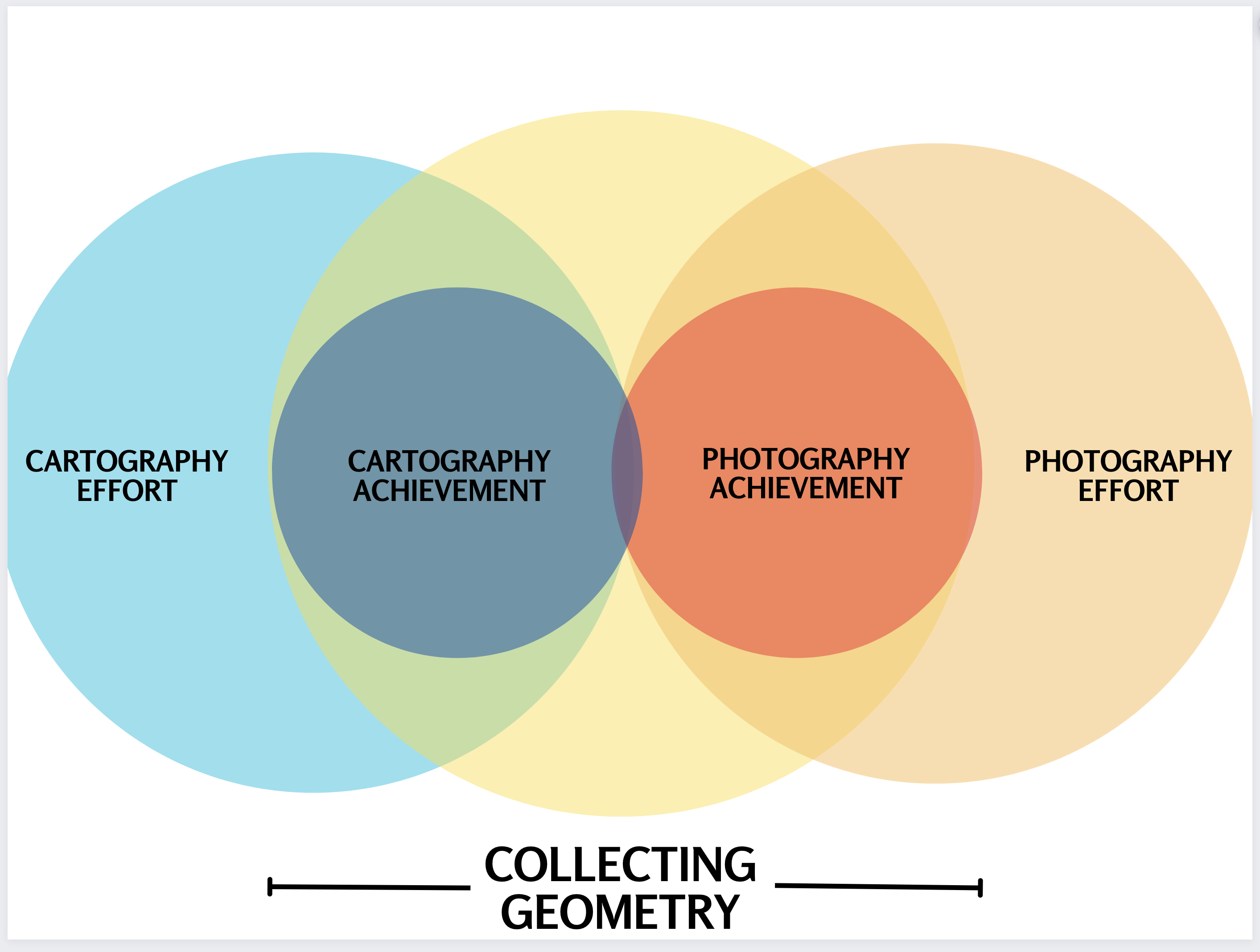 The main original concept this diagram is meant to convey is that the entirety of both cartography and photography when realized in a shareable form consists of the collection of geometry. A photograph with no geometry could be at best solid black or white. Inevitably the composition, production, evaluation, and appreciation of photography consists of using the human visual system to take in a pattern reproducing light collected at a different place and time using photochemistry or a digital sensor.