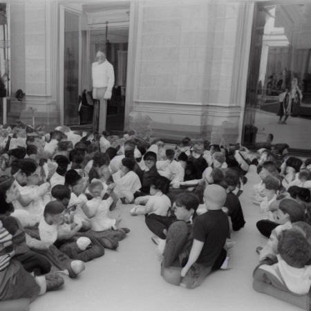 Produced with DiffussionBee and the prompt: “Artistic professional photo taken in the year 2075, showing young students on a school tour of a museum exhibit explaining the harms done by automobiles and their association with the now-discredited political ideologies of the early century”