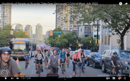 Critical Mass is one of the most brilliant forms of non-violent direct action ever devised. Today’s Vancouver ride showed me the city like I never saw it in 22 years growing up, and felt like the safest bike ride I ever took. Safe in the middle, I never worried about a single car. There were pairs of kids on the back of long e-bikes; dogs in carriers wearing goggles; several audio mixes from portable speakers in different parts of the mass; and a lot of good grace and patience — as well as a great deal of overt support — from pedestrians as well as drivers.