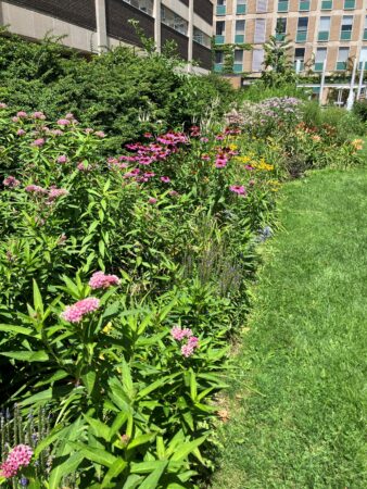 There are Black-Eyed Susans (Rudbeckia hirta) farther back and then maybe Culver’s Root (Veronicastrum virginicum).