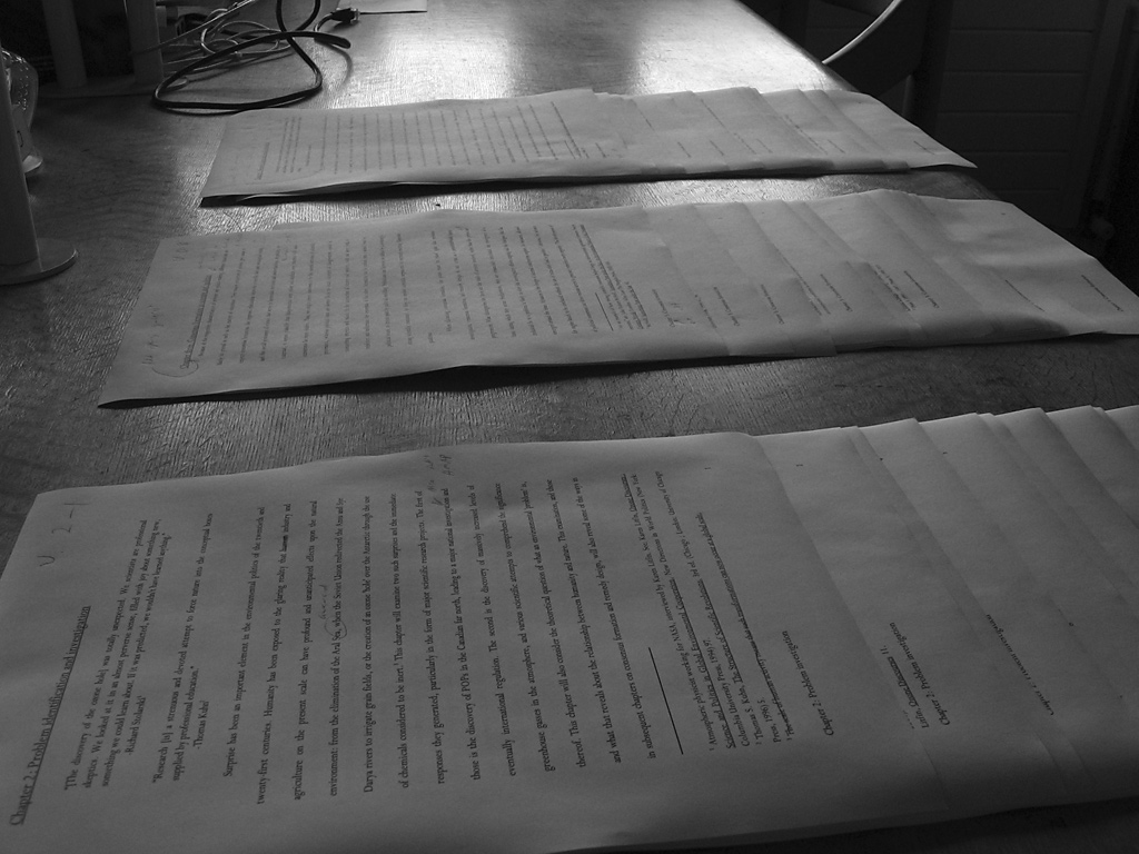 While distant forests shrieked at me from afar this afternoon, I printed off a copy of the most recent versions of my three substantive chapters and reviewed them in the Wadham Library. As much as I am used to spending ten hours of more watching words glow on an LCD display, editing only seems to reach its full potential when there are things to be crossed out, big arrows to be drawn, and incisive notes to be written with the margins.
